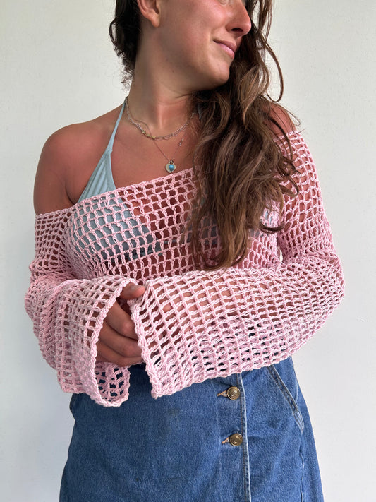 Baby pink crochet flare sleeve long sleeve top (L/XL)