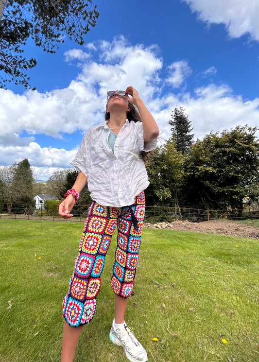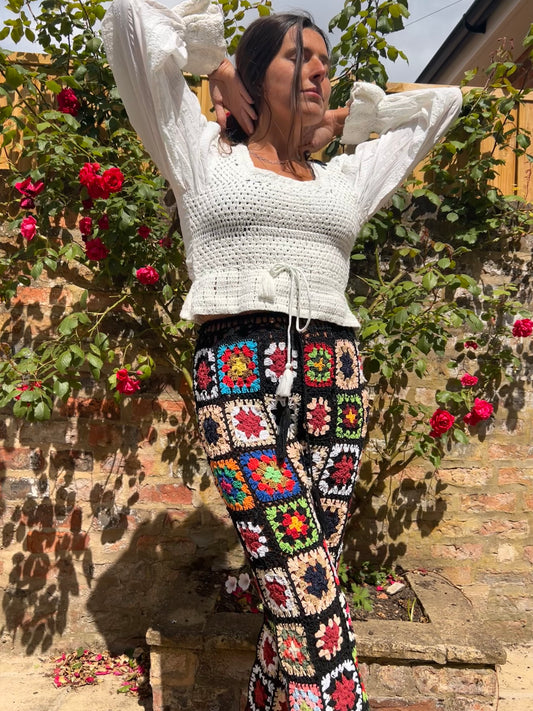 Black Granny square flare trousers with drawstring waist L/XL