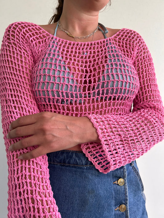 Bubblegum pink crochet flare sleeve long sleeve top (M/L)