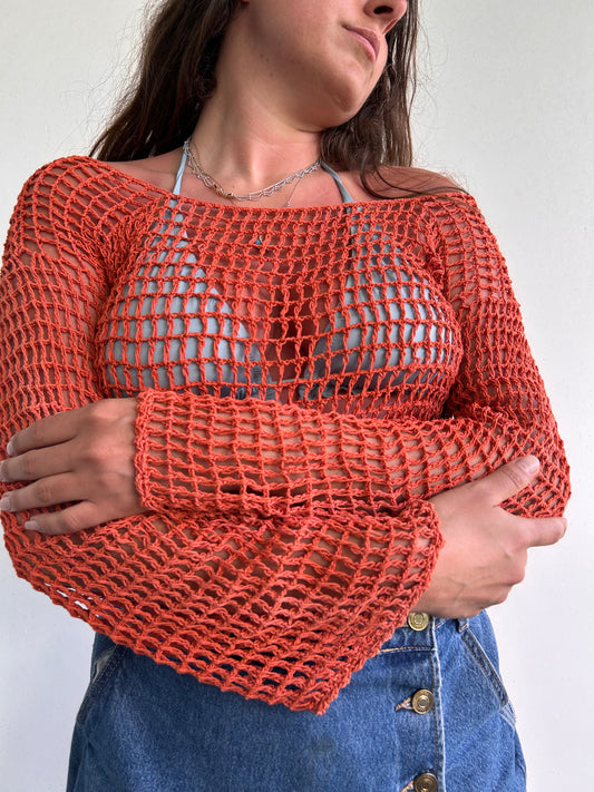 Burnt orange mesh crochet flare sleeve long sleeve top (M/L)