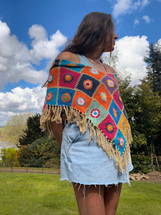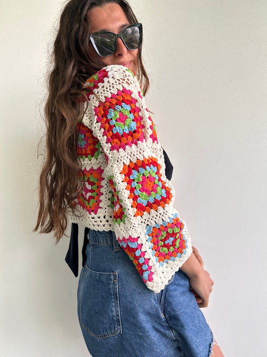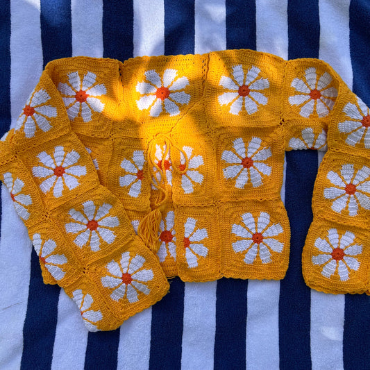 Flower Power 70’s inspired crochet cardigan with tassel tie